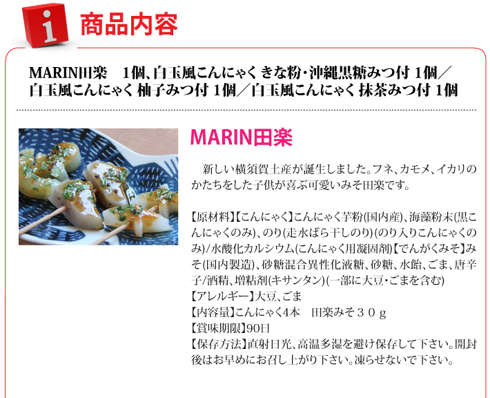 送料無料(ラッピング・送料込みで企画されたギフト商品)でお届けします。フネ、カモメ、イカリのかたちをした子供が喜ぶ可愛いみそ田楽と白玉風こんにゃくのセットです。こんにゃくで作っているので低カロリーなスイーツです。白玉月は白玉のように白く、女性や子供に人気の白玉団子をこんにゃくで作ったもちもちぷるぷるの深食感です。こちらは、柚子みつ・抹茶みつ、黒蜜きなこの3種類をセットにしています。白玉粉を使わないのでカロリーが少なくとってもヘルシーです。【生産者】森定商店(神奈川県横須賀市)【内容量】MARIN田楽 1個、白玉風こんにゃく きな粉・沖縄黒糖みつ付 1個/白玉風こんにゃく 柚子みつ付 1個/白玉風こんにゃく 抹茶みつ付 1個【ラッピング】化粧箱・熨斗【発送時期】ご注文後、約3日~7日(常温配送)【賞味期限】MARIN田楽:90日 白玉風こんにゃく:60日【保存方法】直射日光、高温多湿を避け保存して下さい。開封後はお早めにお召し上がり下さい。凍らせないで下さい。【贈り物】誕生日プレゼント/還暦祝い/お礼/お祝い/内祝い/お見舞い品