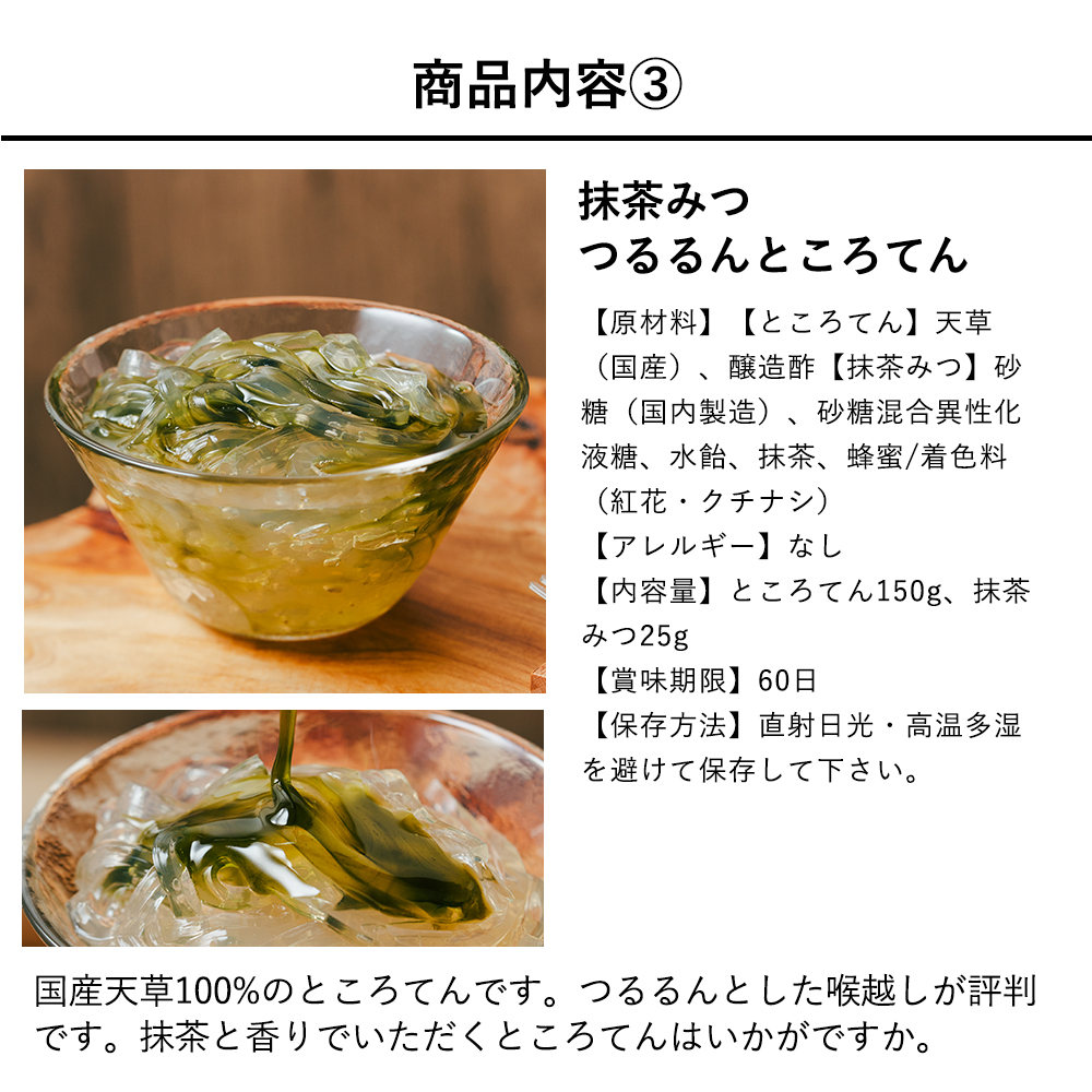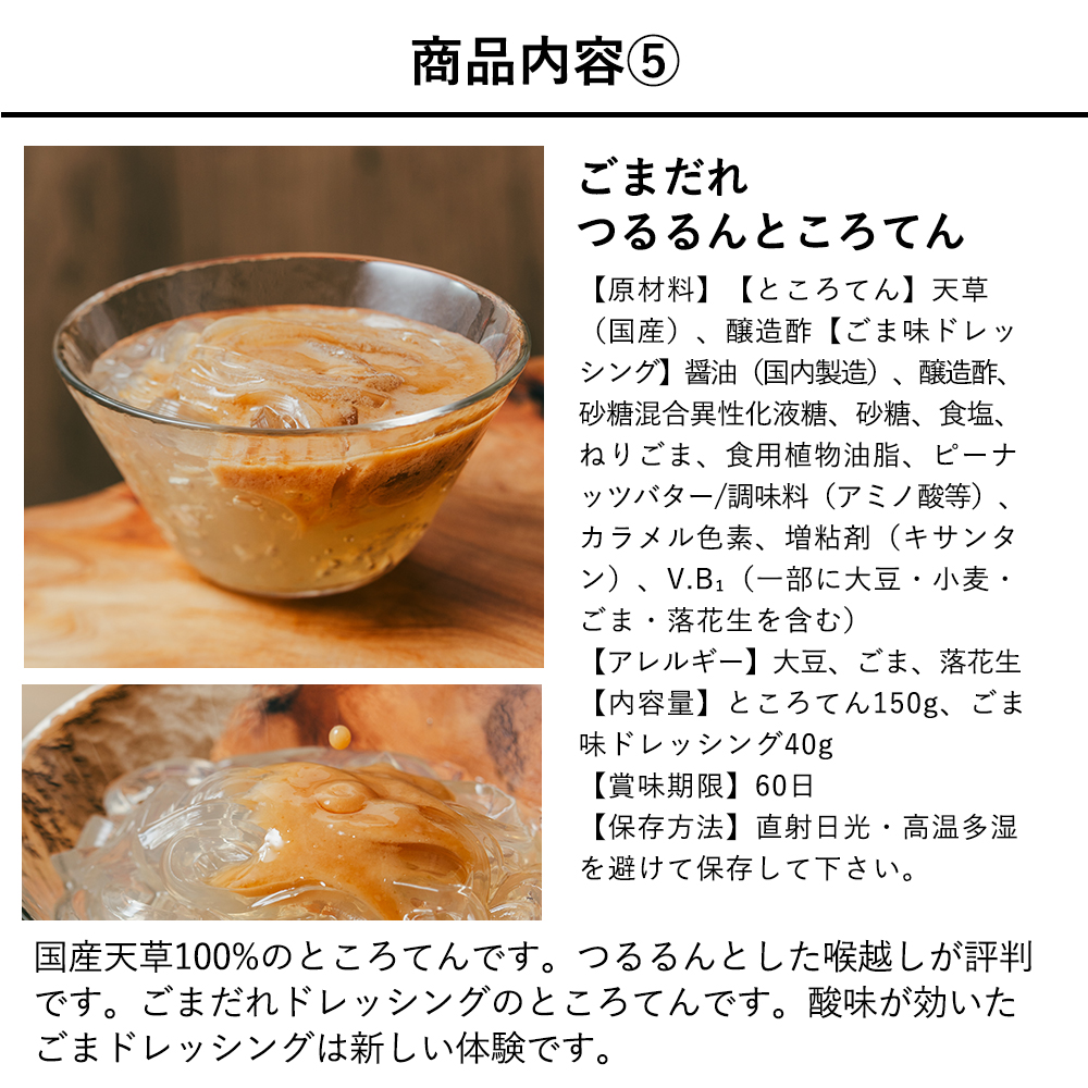 送料無料・ギフト専用化粧箱にてお届けします。つるるんとしていると人気の森定商店のところてんに5つの味をお楽しみいただけるギフトセットです。関東では三杯酢や酢醤油が一般的なところてんも、関西では甘いみつをかけて食べる方が多いです。5種類の味を詰め合わたバラエティセットです。低カロリーで多くの方に喜ばれ、健康ギフトにぴったりのところてんセットです。【生産者】森定商店(神奈川県横須賀市)【内容量】三杯酢 つるるんところてん150g×2、ゆずみつ つるるんところてん150g×1、抹茶みつ つるるんところてん150g×1、黒糖みつ つるるんところてん150g×1、ごまだれ つるるんところてん150g×1【ラッピング】化粧箱・熨斗【発送時期】ご注文後、約3日~7日(常温配送)【賞味期限】60日【保存方法】直射日光・高温多湿を避けて保存して下さい。【贈り物】誕生日プレゼント/還暦祝い/お礼/お祝い/内祝い/お見舞い品/志