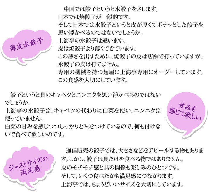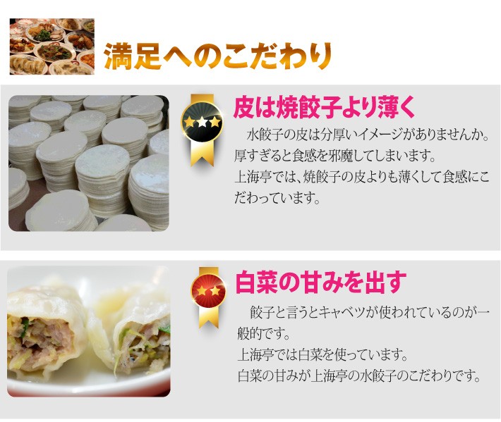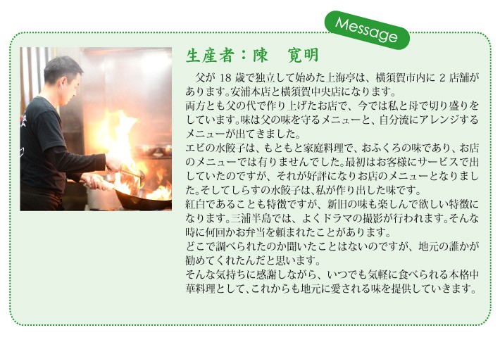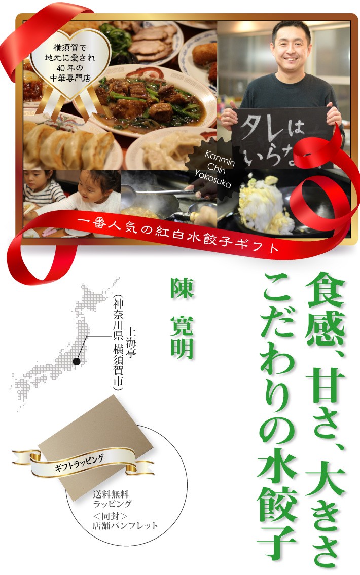 ■テレビで紹介されました!-----------------------------------------送料無料(ラッピング・送料込みで企画されたギフト商品)でお届けします。横須賀の老舗 上海亭の人気メニューの水餃子セットです。皮が薄いのが特徴で白菜の甘みを際立たせた水餃子です。ニンニクを使っていないので、子供でも食べられます。海老としらすの水餃子の2種類セット(15個づつ)です。【生産者】上海亭(神奈川県横須賀市)【セット内容】海老水餃子×15個、しらす水餃子×15個【ラッピング】箱・熨斗【発送時期】ご注文後、約1日~5日(冷凍配送)【賞味期限】製造日より90日【保存方法】冷凍庫にて保存してください。【贈り物】誕生日プレゼント/還暦祝い/お礼/お祝い/内祝い