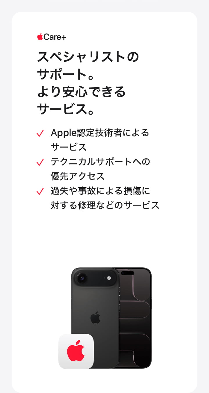 - すべてのiPhoneには、製品購入後1年間のハードウェア製品限定保証と90日間の無償サポートがついています。保証とサポートが延長され、過失や事故による損傷に対する修理などのサービスを利用回数の制限なく受けられます。
