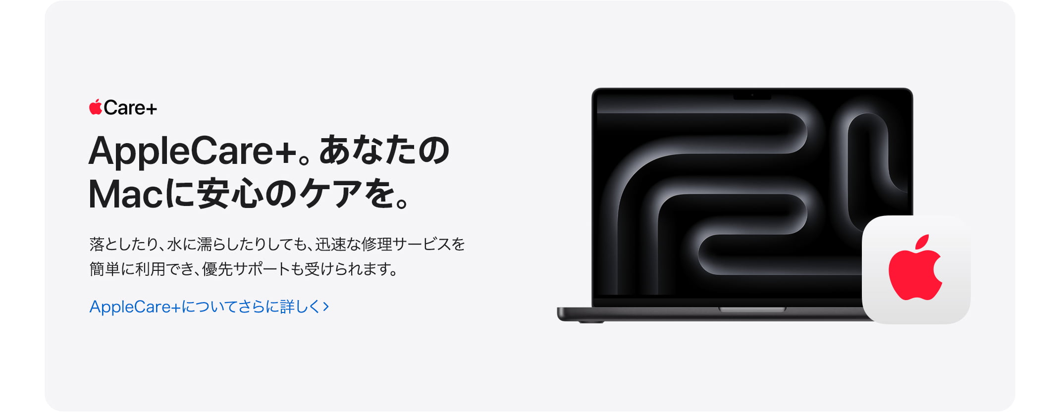 - すべてのMacには、製品購入後1年間のハードウェア製品限定保証と90日間の無償テクニカルサポートがついています。AppleCare+ for Macに加入すると、保証とサポートがAppleCare+の購入日から延長されます。さらに、過失や事故による損傷に対する修理などのサービスを、1回につき画面または外部筐体の損傷は12,900円(税込)、そのほかの損傷は37,100円(税込)のサービス料で、利用回数の制限なく受けられます。Appleの専任スペシャリストにチャットまたは電話で優先的に問い合わせることもできます。