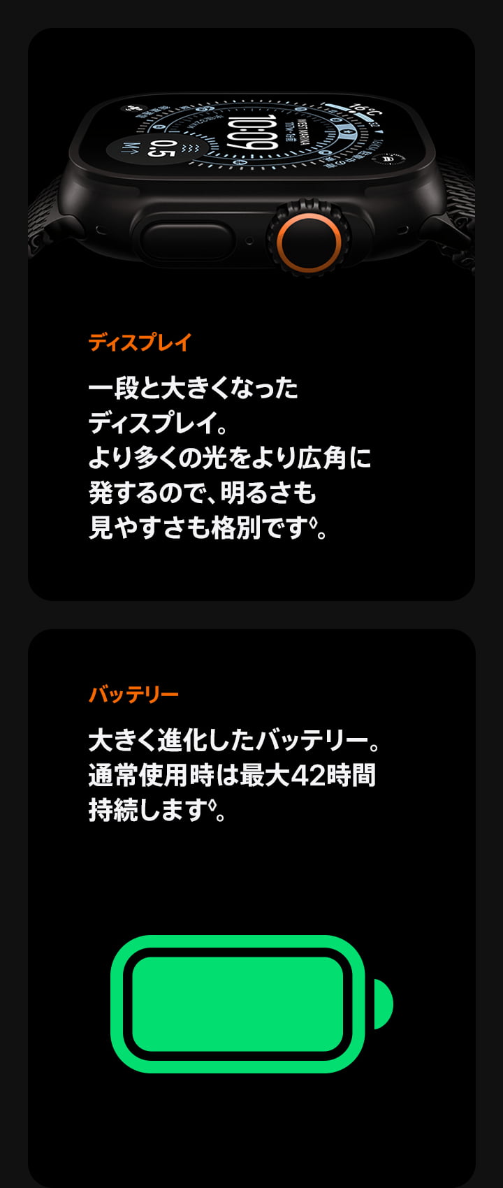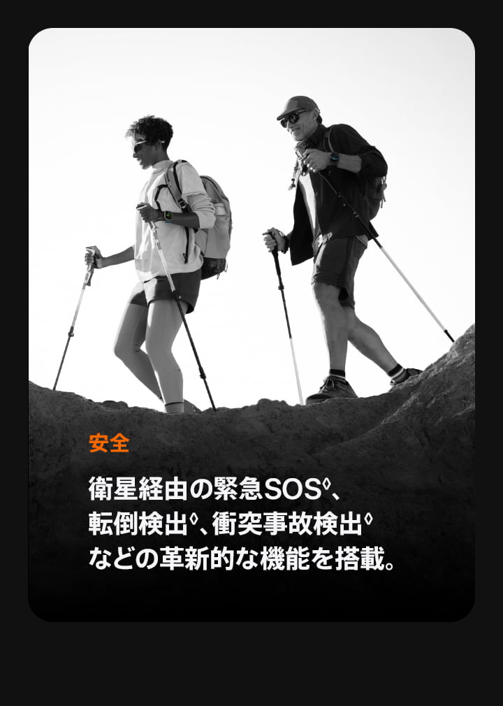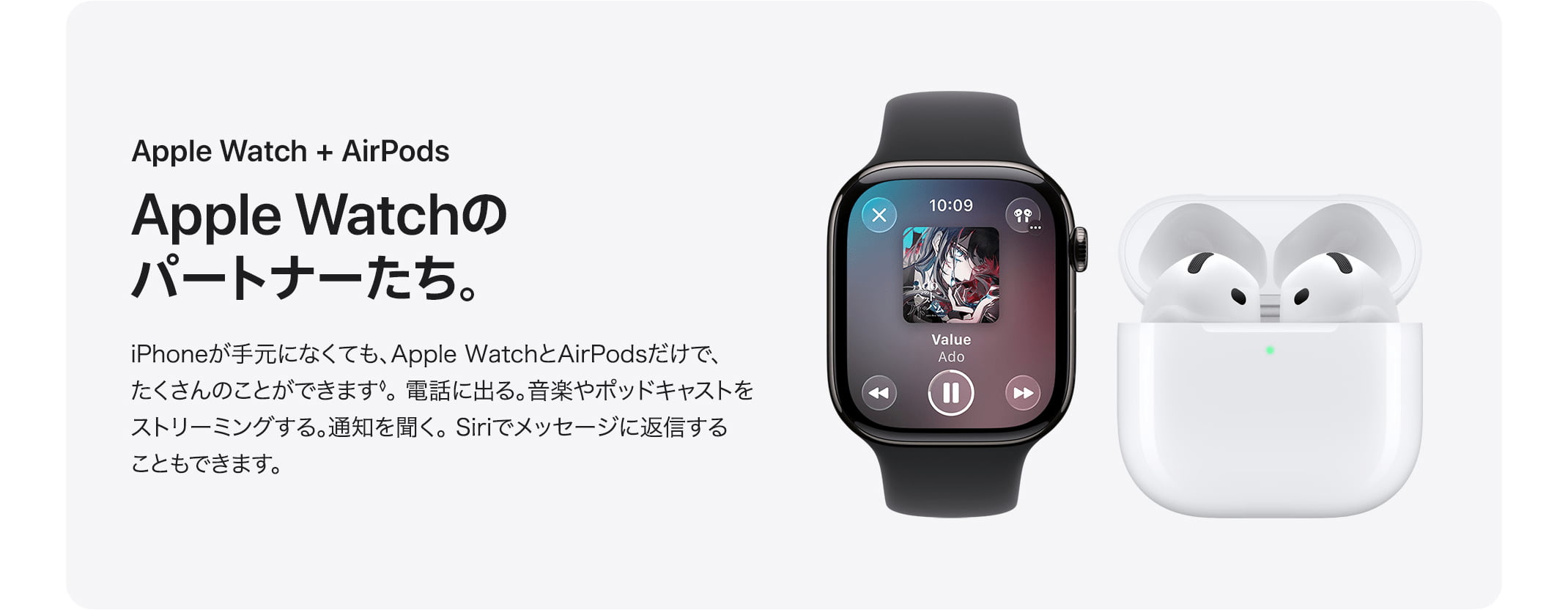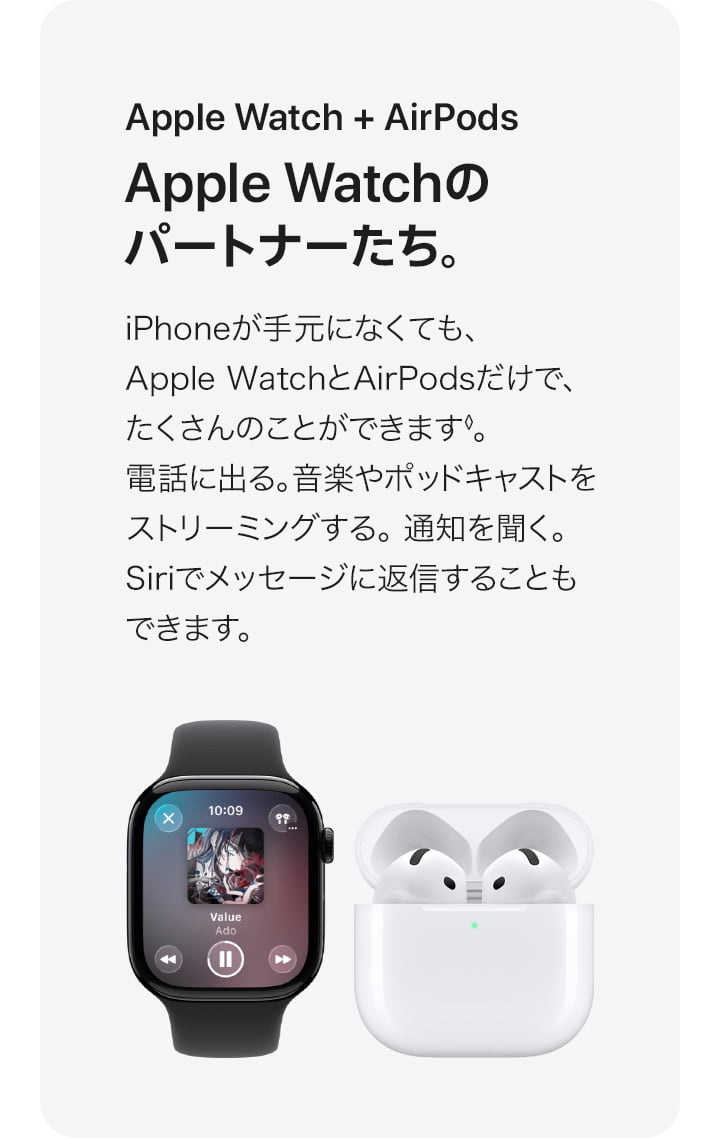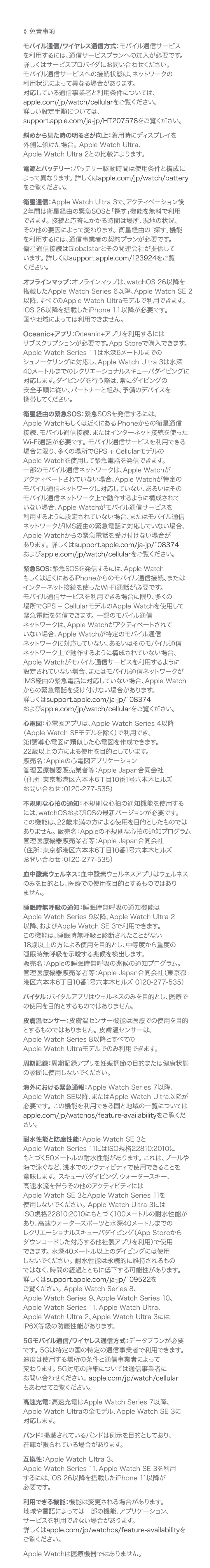 すべてのApple WatchとApple Watch Ultraには、製品購入後1年間のハードウェア製品限定保証と90日間の無償サポートがついています。AppleCare+ for Apple Watch、またはAppleCare+ for Apple Watch Ultraに加入すると、保証とサポートが延長されます。さらに、過失や事故による損傷に対する修理などのサービスを、1回につきApple Watchは9,200円、Apple Watch Ultraは10,700円のサービス料で、利用回数の制限なく受けられます。Appleの専任スペシャリストにチャットまたは電話で優先的に問い合わせることもできます。詳細については規約をご覧ください。